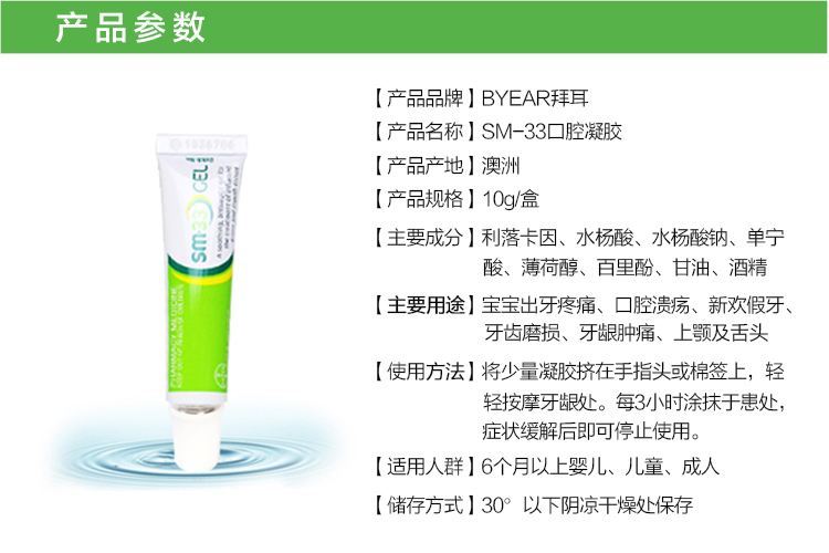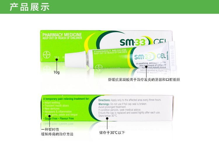 用過最好用最給力的口腔溃疡膏,效果超級明显 每個家庭必備的澳洲神藥之一!涂上去会有一点点刺痛,不过好的很快,6个月以上婴儿就能用,SM-33口腔凝胶无色无味,不添加防腐剂。三步就可以抑制住牙龈肿痛,杀菌剂可以防止肿胀牙周部位的感染,天然收敛剂可以镇静发炎的牙龈。可以减轻牙龈肿痛带来的痛苦。本品为胶状。对于口腔溃疡,新换假牙,牙齿磨损,牙龈肿痛,上颚及舌头起泡非常有效。