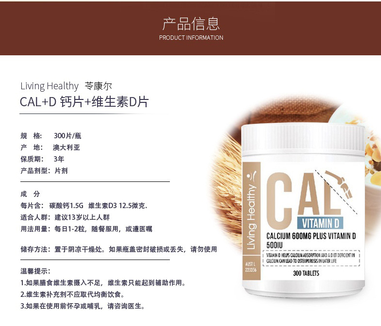 【澳洲仓】Living Healthy 苓康尔 600mg钙+500iu D3 碳酸钙+D3 300片 青少年、孕产妇、中老年、上班族人补钙